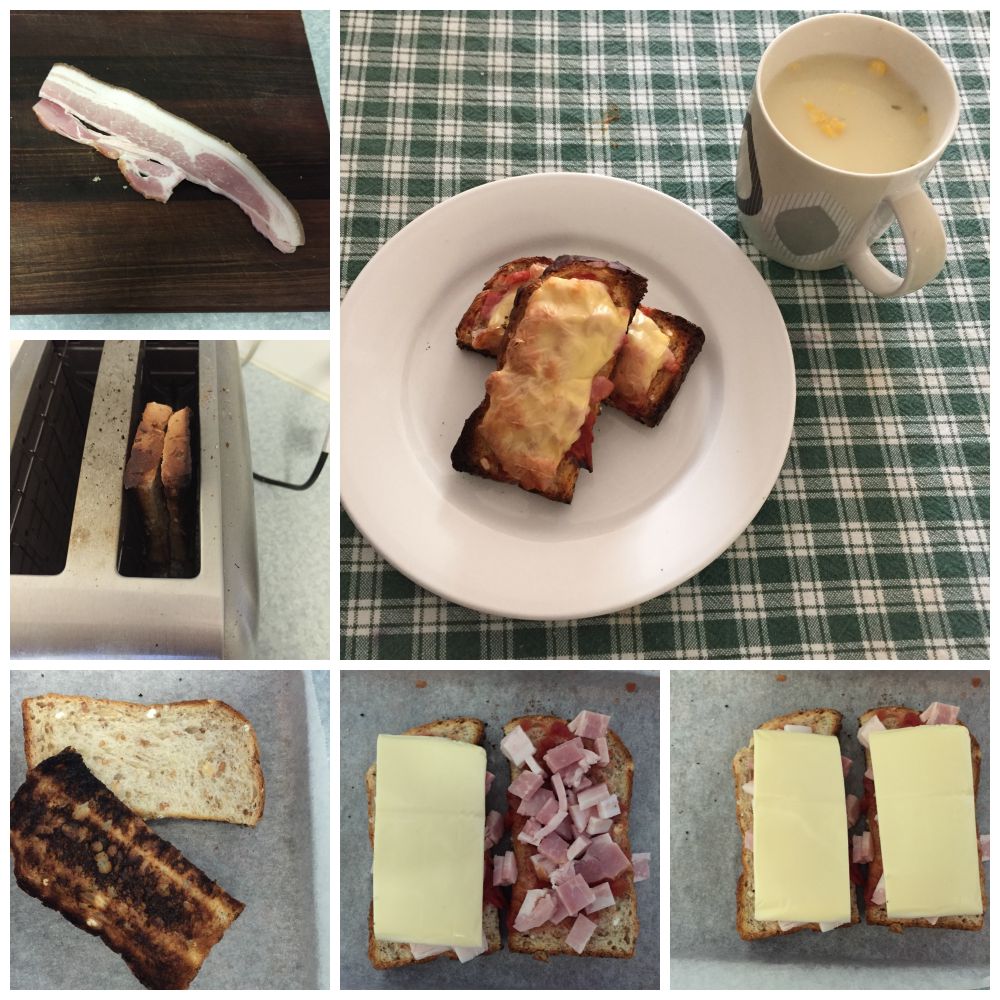 A smear of tomato from my tinned tomatoes for a sauce base add some diced bacon, top with cheese and grill to brown, bubbly deliciousness. A cup-a-soup sachet created a nice warm drink to round out this meal.
